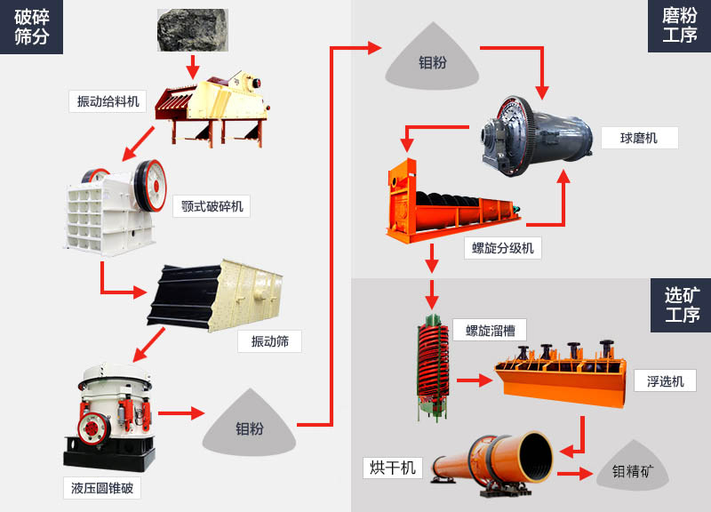 大塊的鉬礦石經(jīng)料倉由振動(dòng)給料機(jī)均勻地送進(jìn)顎式破碎機(jī)進(jìn)行粗碎;粗碎后的鉬礦石經(jīng)過振動(dòng)篩篩分后,由皮帶輸送機(jī)送到液壓圓錐式破碎機(jī)進(jìn)行細(xì)碎;